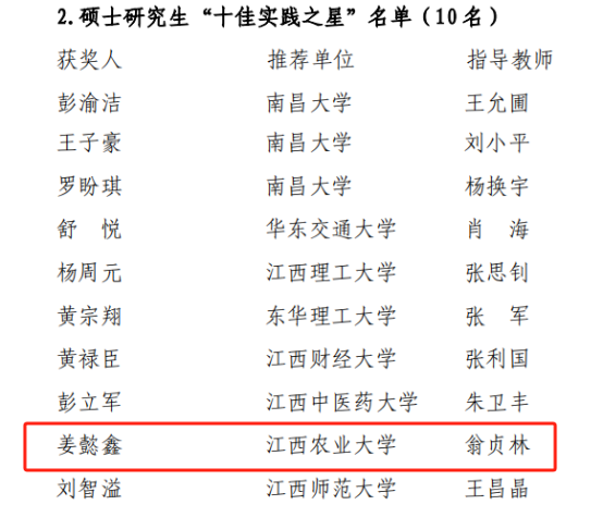 近日,2023年江西省研究生“十佳学术之星”“十佳实践之星”评选结果揭晓,我院2021级农业经济管理专业研究生姜懿鑫获评2023年硕士研究生“十佳实践之星”。