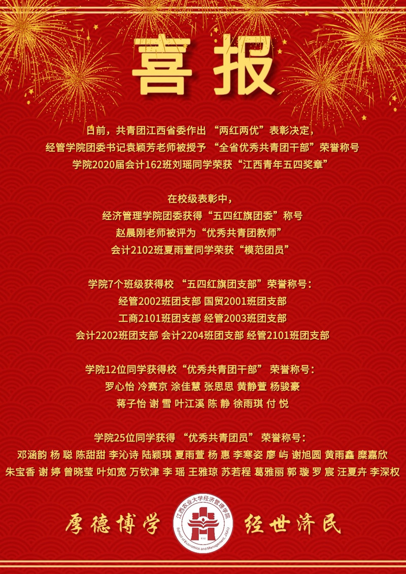 白菜担保平台团委荣获“五四红旗团委”称号;赵晨刚老师被评为“优秀共青团教师”;农林经济管理2002班、国贸2001班等七个团支部被评为“五四红旗团支部”;经管院会计2102班夏雨萱被评为“模范团员”;罗心怡、涂佳慧等12位同学被评为“优秀共青团干部”;邓涵韵、杨聪等25位同学被评为“优秀共青团员”。