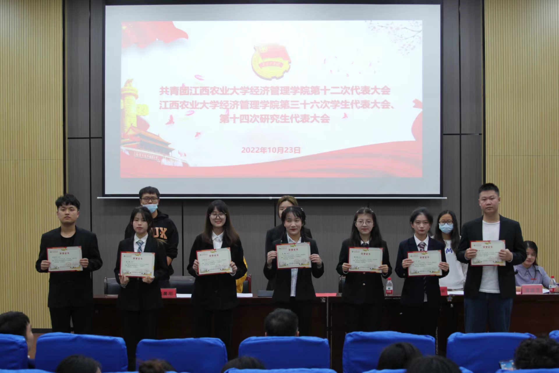 会上,袁颖芳、陈佳庆和万蕾分别代表学院第十一届团委、第三十五届学生会和第十三届研究生分会做工作报告。在通过与会代表现场公开、公正、公平的投票后,大会选举产生了新一届团委、学生会和研究生分会委员。罗婷婷老师和马超老师宣读了学院就业指导服务中心、大学生发展中心新一届委员任命书。大会还表彰了过去一年为学院团学工作做出突出贡献的先进个人。最后,在雄壮的《国际歌》中,大会落下帷幕。