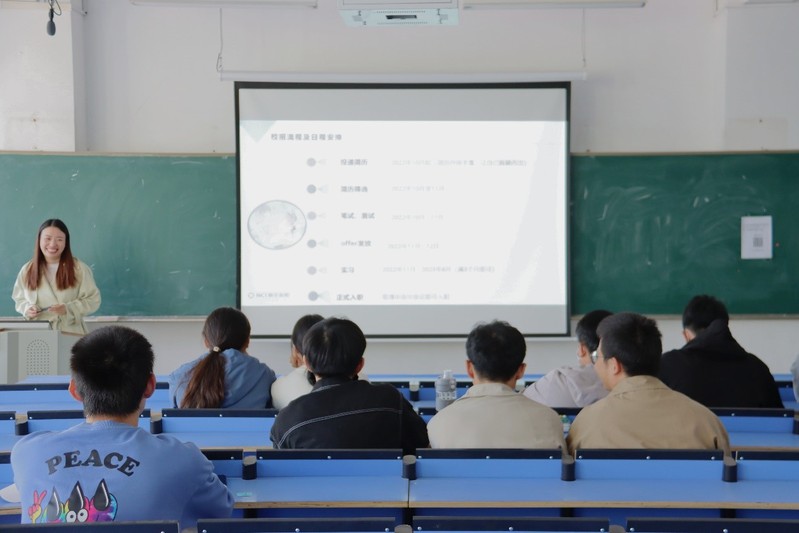 宣讲会伊始,魏经理就该公司的发展历程、企业文化及企业构架等作了详细介绍,并向在场毕业生们充分展现了该公司作为“双世界五百强”企业的雄厚实力。随后,她通过PPT播放的方式讲解了该公司本次岗位的招聘类别及招聘流程,且公司专门为员工制作了一套完整的薪酬福利保障体系,切实符合公司“以人为本”的工作理念。最后,魏经理设置了游戏型的问答互动环节,帮助毕业生们解疑答惑。