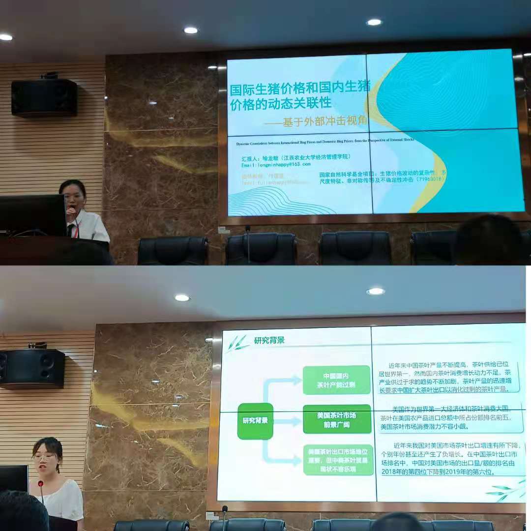 胡冰川、高鸣和曾福生三位农业经济专家在会议上做了相关主旨报告。会议从众多投稿论文中筛选出20多篇论文作为分论坛报告论文。喻龙敏学员的论文《国际生猪价格和国内生猪价格的动态关联性——基于外部冲击视角》入选,在“生猪价格与农产品出口”分论坛进行了会议报告,接受了与会专家的点评指教,并就相关热点问题与在场学者进行了深入的探讨。进一步拓展学术研究领域和学术交流,发掘不同的创新视角,体现出我院研究生在学术的规范性方面提升颇大。
