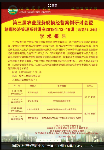 2019年6月16日上午,中国人民大学农业与农村发展学院农村发展研究所所长孔祥智教授;华南农业大学国家农业制度与发展研究院院长;中国社会科学院农村发展研究所党委书记、副所长杜志雄研究员;北京大学现代农学院教授、北京大学新农村发展研究院院长黄季焜教授于经管院报告厅为广大师生带来一场学术饕餮盛宴。其中,孔祥智教授讲解了实现小农户与现代农业发展有机衔接恶问题;罗必良教授主要针对学生的学术论文进行选题与写作方面的指导;杜志雄研究员和广大师生们讨论了农业新型经营主体与家庭农场的问题;黄季焜教授则对信息通讯技术在农户中的应用展开讲解。