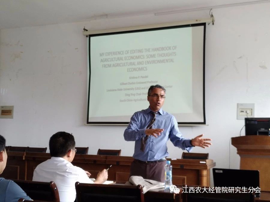 2018年6月19日,美国路易斯安那州立大学农业经济部和农业综合企业部教授和研究员Krishna P. Paudel教授应邀至经管学院做学术报告,报告主题为《My experience of editing the handbook of agricultural economic: some thoughts from agricultural and environmental economics》。