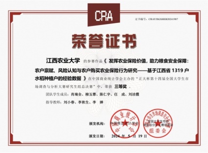 1 | 肖瑞全 | 柳玉蓉(2022级MPAcc)、陈仁宇、任成(2023级MPAcc)、刘洁霞(2023级MPAcc) | 发挥农业保险价值,助力粮食安全保障:农户禀赋、风险认知与农户购买农业保险行为研究——基于江西省1319户水稻种植户的经验数据 | 刘小春,李秋生,李婵 | 国家级三等奖 |