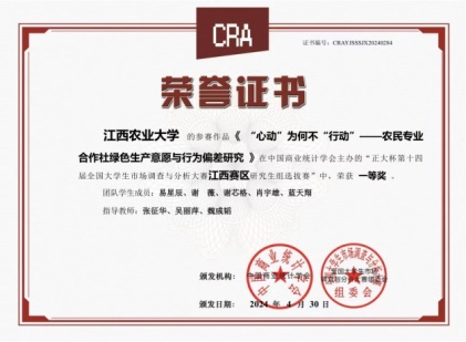 3 | 易星辰 | 谢薇(2023级MPAcc)、谢芯格(2023级MPAcc)、肖宇雄(2022级MPAcc)、蓝天翔(2022级MPAcc) | “心动”为何不“行动”——农民专业合作社绿色生产意愿与行为偏差研究 | 张征华,吴丽萍,魏彧韬 | 省级一等奖 |