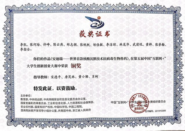 第五届中国“互联网+”大学生创新创业大赛总决赛于2019年10月12日至16日在浙江大学举行。我院李凯、张何培、许峥、陈云燕、郑志拥、张帆帆、邹佳敏、李洁琼、林龙华、武前悦、黄粹、张誉翰、李指全同学所在的团队在此次大赛中荣获铜奖。