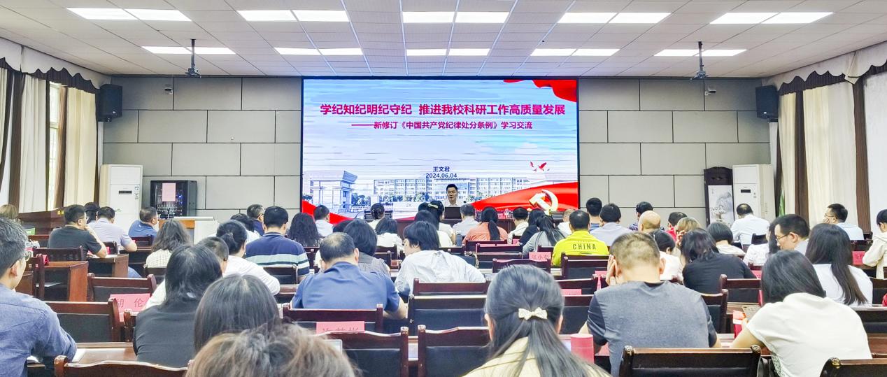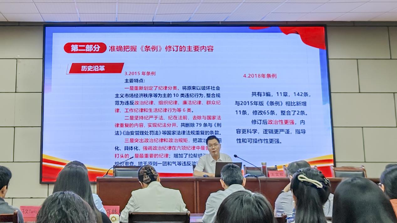 王文君围绕党纪学习教育,从深刻认识修订《条例》的重要意义、准确把握《条例》修订的主要内容、高度重视《条例》修订后与我们的日常工作和生活紧密相联的内容三个部分开展党课讲授,以学校科研工作为切入点,带领学院教工党员共同学习了在科研工作中容易出现的违纪现象,引导广大教工党员加强自我约束、提高免疫能力,明白能干什么、不能干什么,以党纪学习教育推进学校科研工作高质量发展。