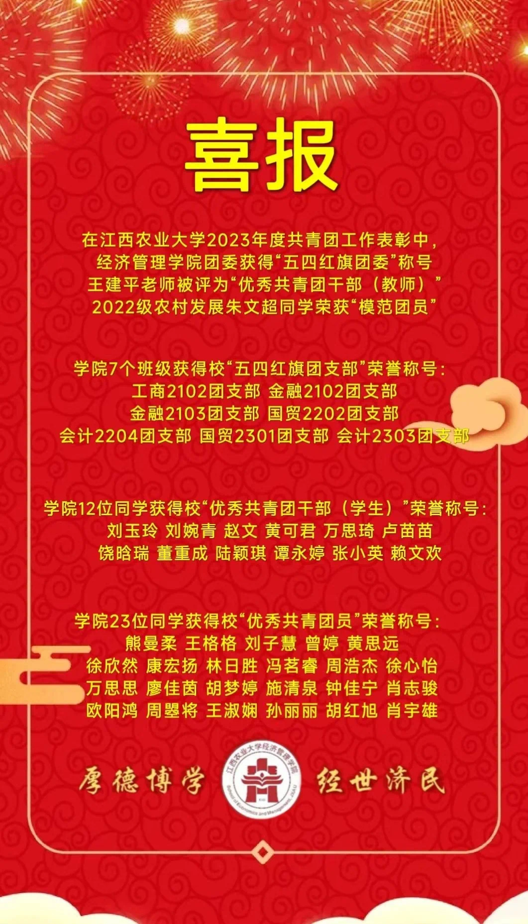 其中,白菜担保平台团委荣获“五四红旗团委”;工商2102、金融2102团支部等7个团支部被评为“五四红旗团支部”;王建平老师被评为“优秀共青团干部(教师)”;2022级农村发展朱文超同学被评为“模范团员”;饶晗瑞、刘玉玲等12位同学被评为“优秀共青团干部(学生)”;熊曼柔、王格格等23位同学被评为“优秀共青团员”。