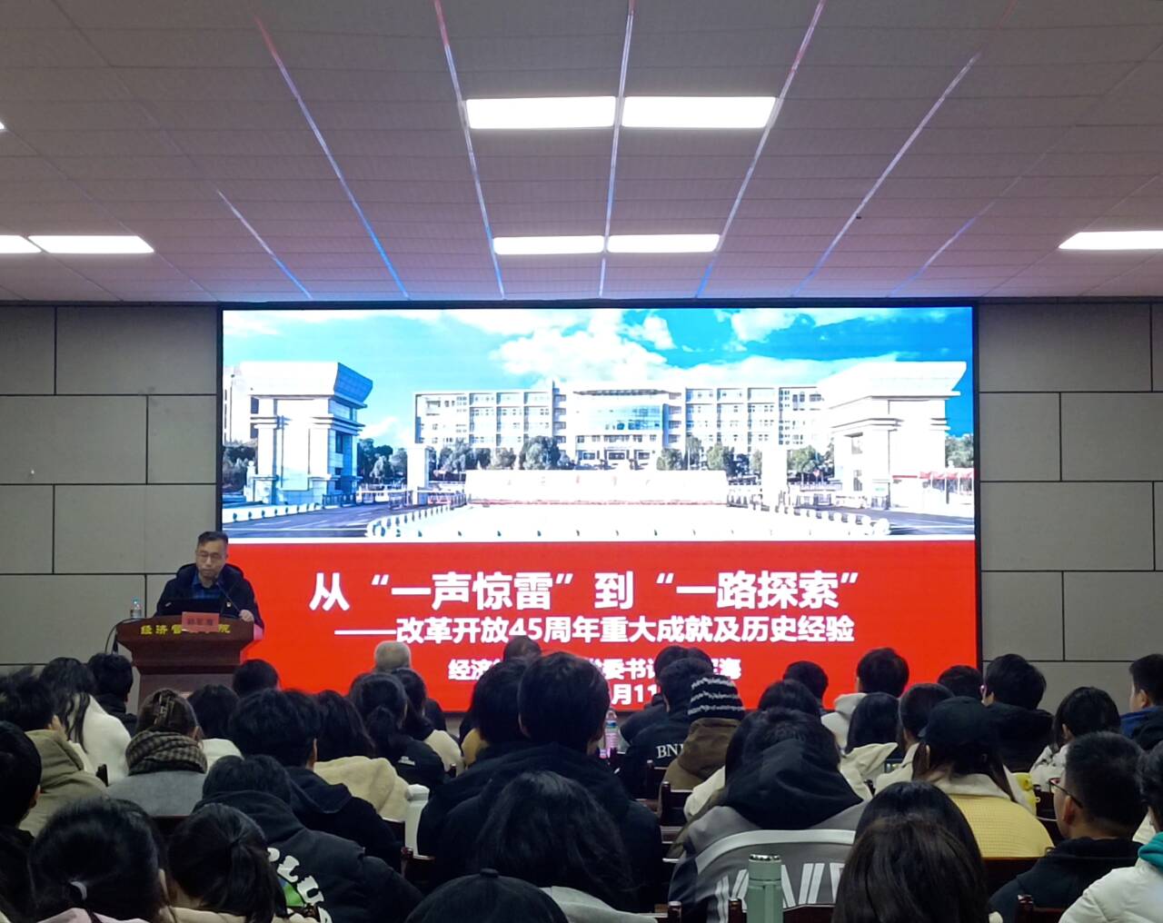 我们的家乡在希望的田野上炊烟在新建的住房上飘荡小河在美丽的村庄旁流淌......”,党课在欢快活泼的《在希望的田野上》拉开序幕。学院党委书记郭军海围绕改革开放的唤醒起点、历史进程、辉煌成就、经验启示、时代新程五个部分深入阐释了改革开放45周年重大成就及进入新时代内涵不断丰富的历史进程结合学院“六个经管”建设落实情况进行了阐述。他强调,唯有开拓进取、齐头并进,才能够披荆斩棘,不断创造美好未来,希望经管学院学子接续奋斗,大力弘扬改革开放精神,争做有理想、敢担当、能吃苦、肯奋斗的新时代好青年。