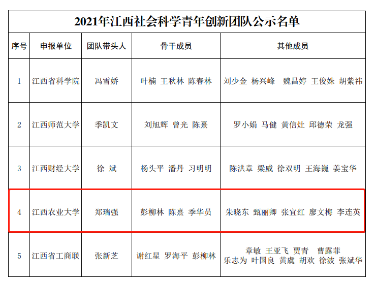 2021年12月30日,江西省社会科学界联合会发布关于成立江西社会科学青年创新团队的通知,我院省级社科团队建设实现突破,郑瑞强副教授领衔,廖文梅教授、李连英副教授参与的团队成功入选2021江西省社会科学青年创新团队,成为仅有的5个入选的省社科青年创新团队之一。