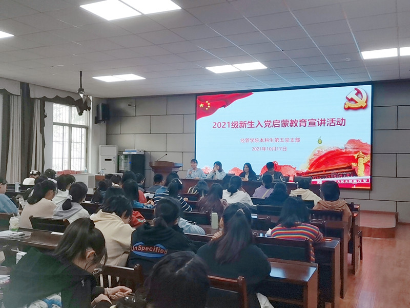 为加深新生对党的了解,鼓励2021级新生积极入党,10月17日上午,经管学院本科生第五党支部在教研楼207室举行2021级新生入党启蒙教育宣讲活动。支部书记余文慧、支部党秘、支部保研学生党员陈莲莲、张小英和会计2103班、会计2104班全体学生参加了宣讲活动。
