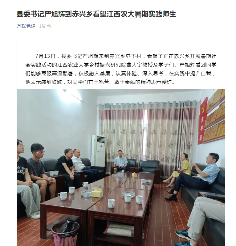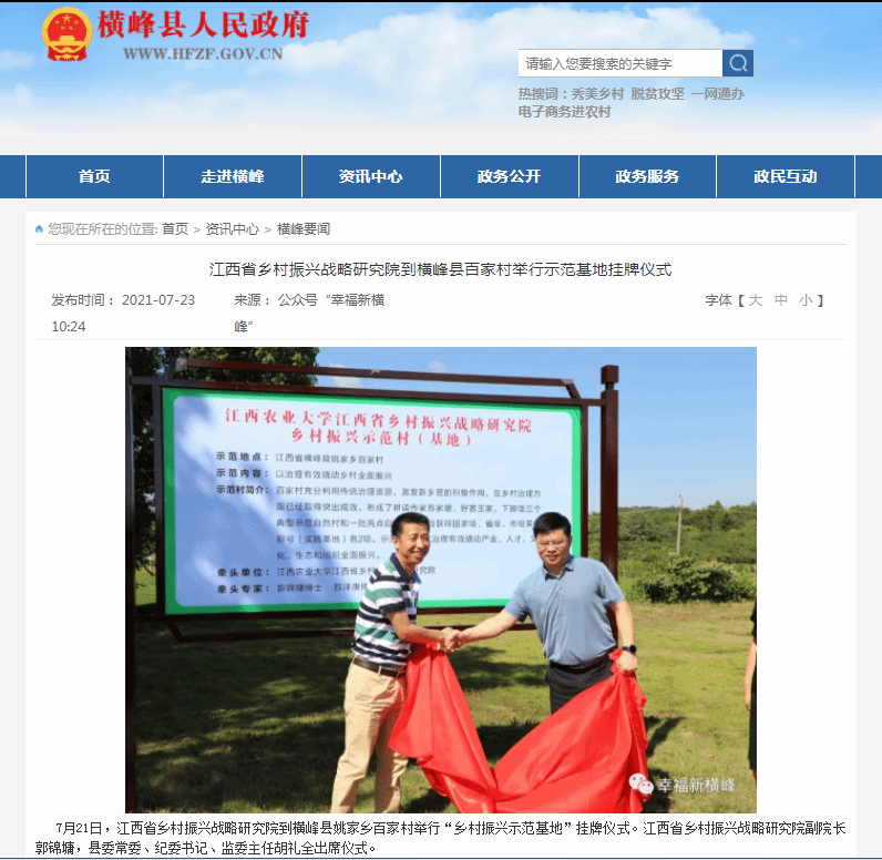 江西省乡村振兴战略研究院乡村振兴示范基地挂牌与调研活动受到当地政府的热烈欢迎,纷纷表示要以产政校融合为契机,加大对乡村振兴示范基地的支持力度,共同探索乡村振兴的有效路径,促进江西乡村振兴。此外,大江网等官方媒体关注了研究院乡村振兴示范基地挂牌与驻村调研活动。