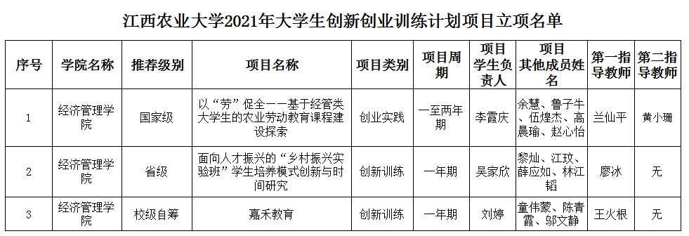 近日,我校发布《关于公布我校2021年大学生创新创业训练计划项目推荐国家级、省级立项及校级立项项目名单的通知》(赣农大创发{2021}4号)文件,由我院教师指导的3个项目获批立项,其中国家级1项,省级1项,校级1项。具体信息如下表所示: