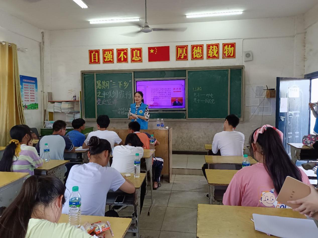 风吹麦浪,金黄灿烂。7月8日上午,剑霞村初高中生同上了一堂党史教育主题课。“1921年7月,中国共产党第一次全国代表大会在上海秘密举行。因遭到上海法租界巡捕袭扰,会议被迫中止。但代表们并没有退缩.......”在稻香四溢的学校,剑霞小分队成员通过宣讲,与在场初高中生一起回顾中国共产党从成立到艰难发展再到逐渐壮大的发展过程。