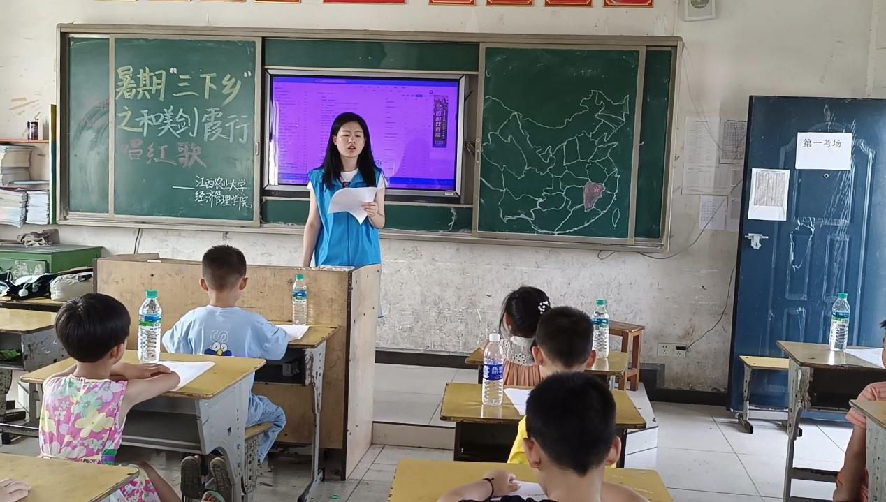 在活动过程中,实践团成员与小朋友进行一对一的教学交流,教学结束后便由剑霞小分队成员和小朋友一起进行红歌传唱互动,同时成员们通过举例说明祖国和自己不能分割,让小朋友能在会唱的同时也能懂,将党和国家的文化魅力传递出去。其中一位小朋友还积极主动站上讲台,用稚嫩的童声歌唱祖国,赢得了所有人的热烈掌声。