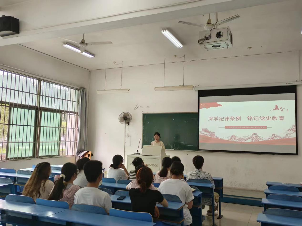 为进一步学习贯彻《中国共产党纪律处分条例》,增强支部党员的纪律意识和规矩意识,白菜担保平台本科生第四支部于2024年6月12日在e教109教室隆重举行了以“深学纪律条例,铭记党史教育”为主题的党日活动。