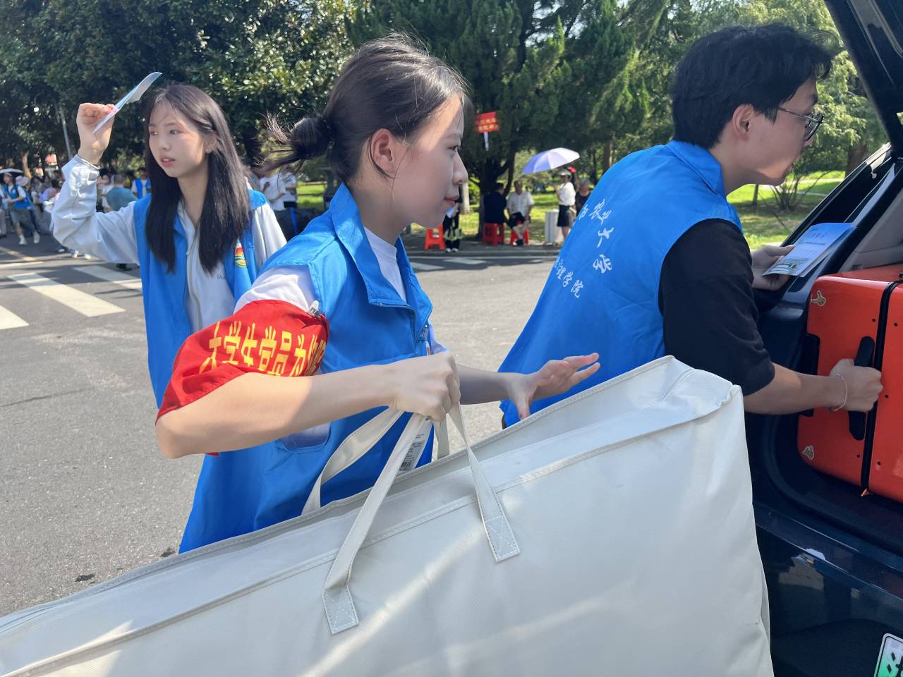 支部全面部署,成员分工明确。大家身穿“蓝马甲”,手戴“红袖标”,冲在前面,服务新生。开学之际车辆众多,道路拥挤,支部成员在帮助新生定点卸行李的同时引导自驾车辆有序停车,节省停车时间,协助配合院内各部门工作,有效避免车辆堵塞问题的出现。部分支部成员扛行李、拉箱子,帮助新生顺利抵达寝室,也向他们介绍了校内主要建筑,助力新生与大学生活“无缝衔接”,在全心全意为人民服务的实践中淬炼党性、提升道德修养和思想境界。