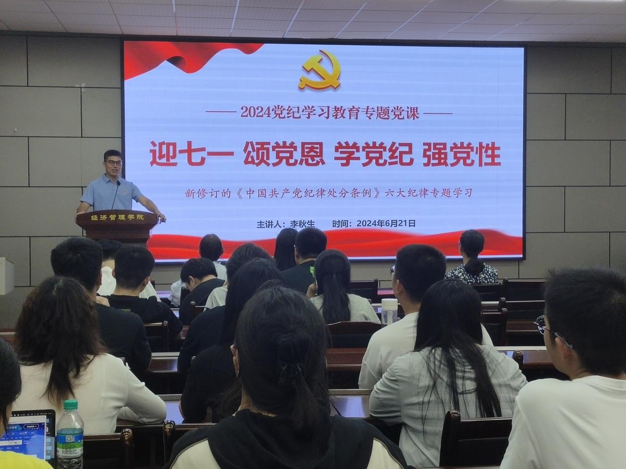为庆祝中国共产党成立103周年,弘扬伟大建党精神,激励支部全体党员同志守初心、强党性、担使命,6月21日下午,研究生第一党支部在经世楼207开展“迎七一颂党恩 学党纪 强党性”活动暨党纪学习教育专题党课,支部党员及入党积极分子参与,支部书记李秋生主持此次活动。