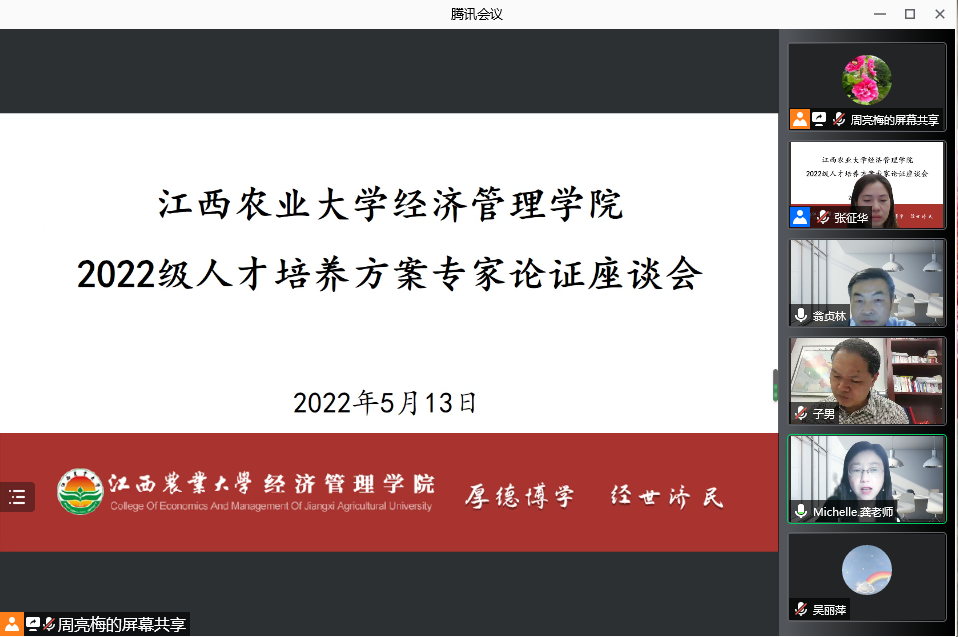 5月13日晚上19点整,经管学院举行2022级人才培养方案专家论证线上座谈会,会议由学院副院长张佂华主持,七位校外专家受邀参会,学院院长翁贞林及所有教研室主任、副主任,学工办负责人等共50多人参加。