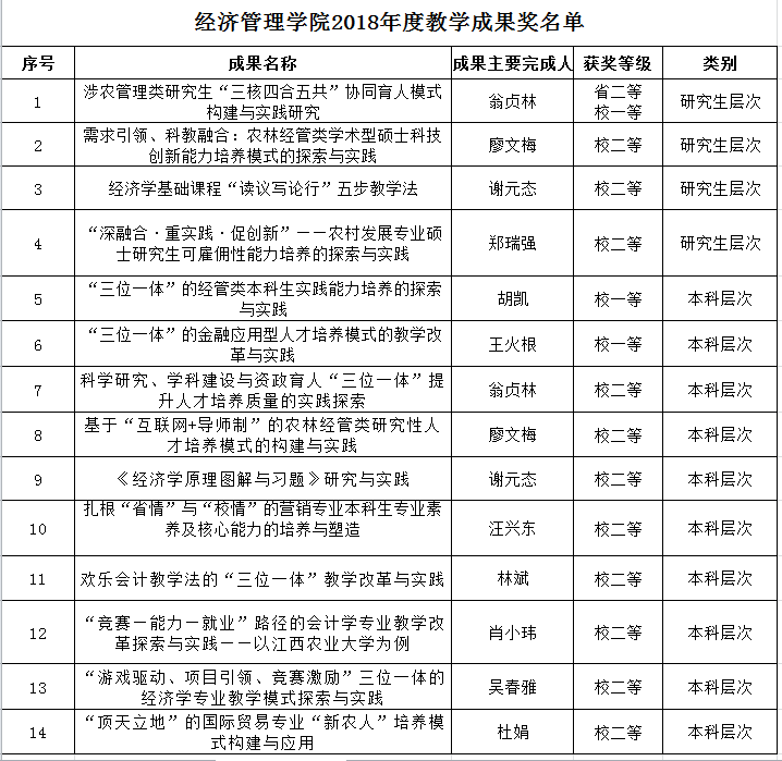 今年7月,江西省教育厅公布了第十六批江西省高校省级教学成果奖名单,我院获省级二等奖1项。另据《关于公布2018年校级教学成果奖名单的通知》(赣农大教发【2019】23号)和《关于公布2018年校级研究生教学成果奖名单的通知》(赣农大研发【2019】35号)文件,我院获校级教学成果奖14项,其中研究生层次一等奖1项,二等奖3项;本科生层次一等奖2项,二等奖8项。具体信息如下表所示: