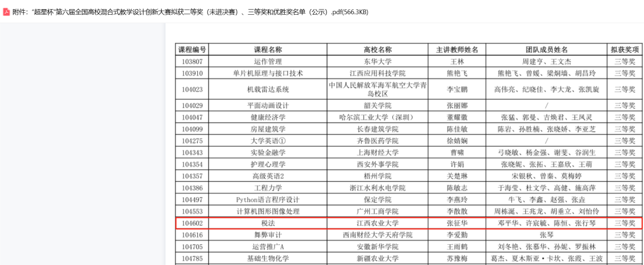 近日,我院张征华教授领衔的《税法》课程教学团队(团队成员:邓平华、许宸毓、陈恒、张行琴),凭借其新颖独特的教学设计及前瞻性的创新理念,在“超星杯”第六届全国高校混合式教学设计创新大赛中脱颖而出,荣获全国三等奖,实现了我院在国家级教学赛事中零突破。