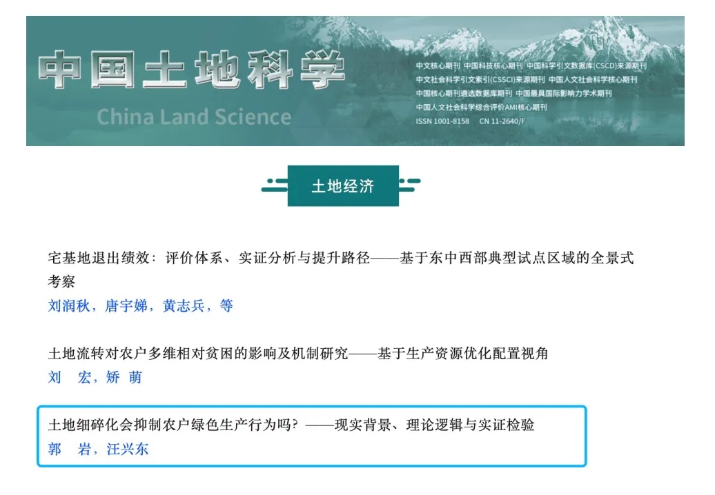 近日,汪兴东教授作为通讯作者的文章“土地细碎化会抑制农户绿色生产行为吗?——现实背景、理论逻辑与实证检验”发表在CSSCI来源期刊《中国土地科学》2024年第4期,第一作者为汪兴东教授所指导的博士生郭岩。