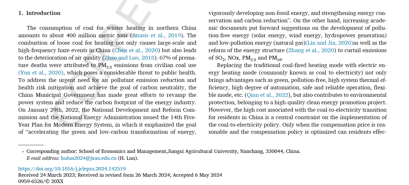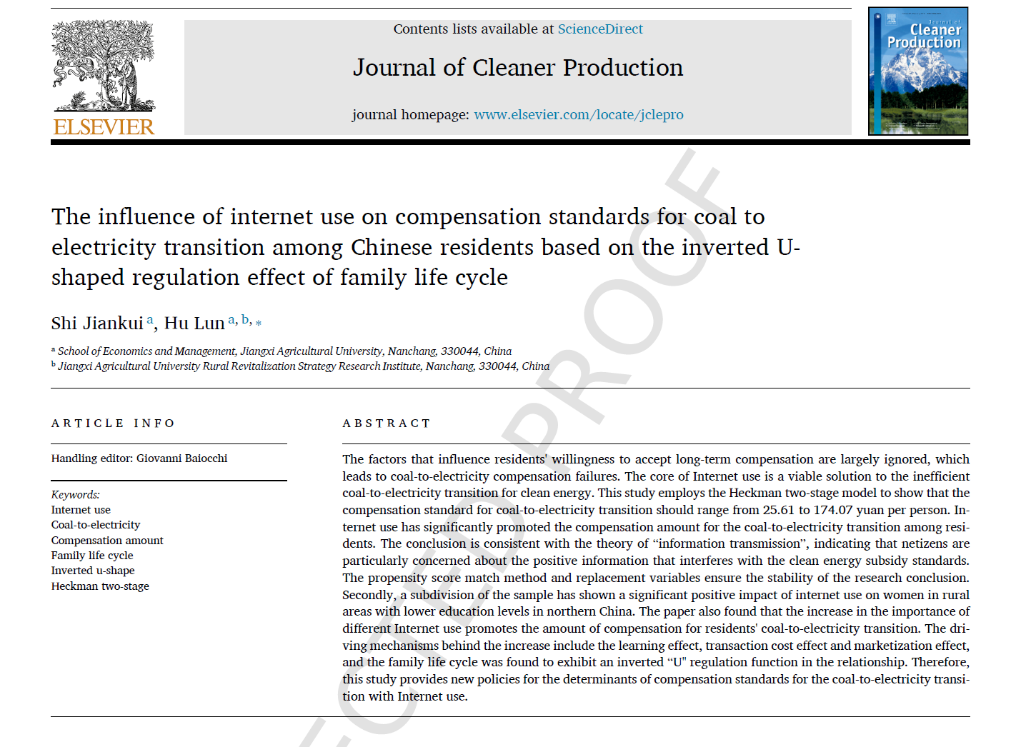 近日,乡村振兴战略研究院研究员、白菜担保平台教师胡伦博士作为通讯作者,指导农林经济管理2003班本科生——施建魁同学撰写的文章“The influence of internet use on compensation standards for coal to electricity transition among Chinese residents based on the inverted Ushaped regulation effect of family life cycle”发表在《Journal of Cleaner Production》(中科院,1区TOP期刊,影响因子11.1)。我院本科生以第一作者在高水平外文期刊发表学术论文表明我院本科教育成果显著,本科教育质量不断提高。