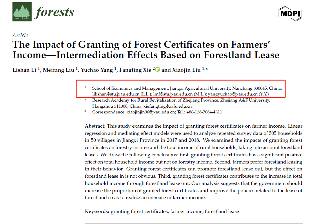 近日,经管学院教师刘小进博士作为通讯作者指导经济学2101班本科生李莉珊同学的文章“The Impact of Granting of Forest Certificates on Farmers’ Income—Intermediation Effects Based on Forestland Lease”发表在《Forests》(中科院2区,影响因子2.9)。