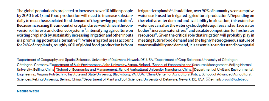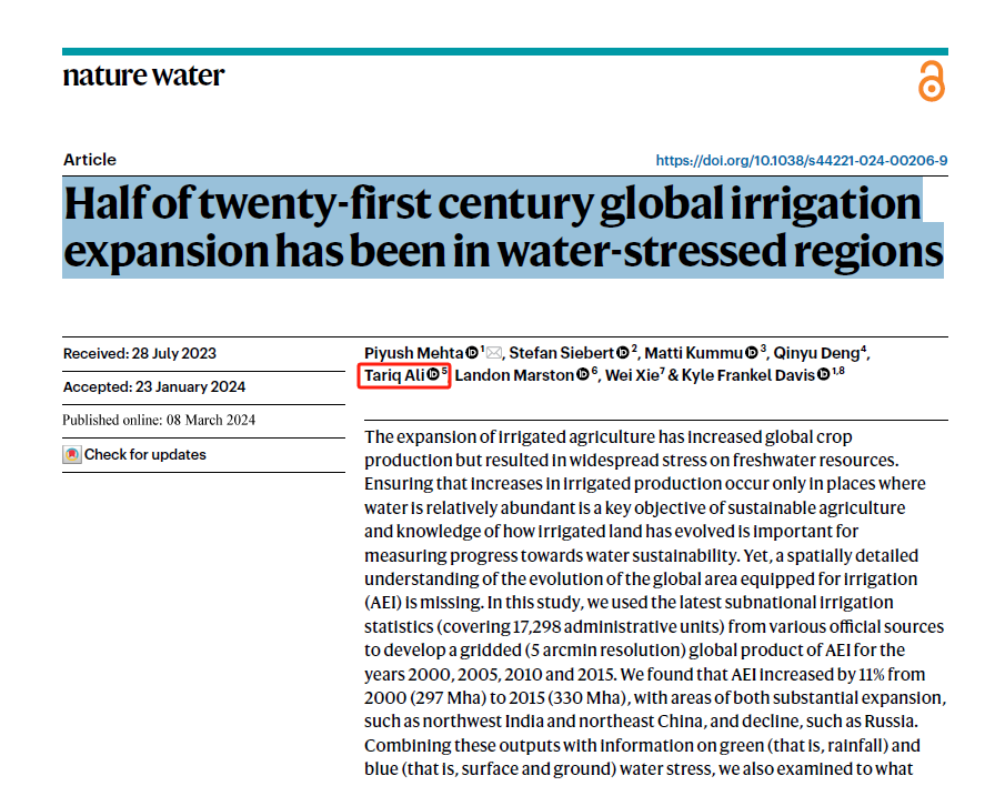 我院马文教授与北京师范大学、北京大学、德国哥廷根大学、美国特拉华大学等国内外的学者合作撰写的论文“half of twenty-first century global irrigation expansion has been in water-stressed regions”在《Nature》子刊《Nature Water》发表。该文着眼于灌溉农业的发展虽促进全球农作物产量增加,但对淡水资源造成巨大压力,且已有研究鲜有关注全球农业灌溉区域的时空变化。在这项研究中,研究团队使用了各国官方来源的灌溉统计数据(涵盖17298个行政单位),开发了2000年、2005年、2010年和2015年农业灌溉区域的网格化(5 arcmin分辨率)全球产品。发现从2000年的2.97亿公顷增加到2015年的3.3亿公顷,农业灌溉区域增加了11%,印度西北部和中国东北部等地区大幅扩张,俄罗斯等地区则有所下降,且超过一半(52%)的灌溉扩张发生在2000年已经缺水的地区。研究发现为全球灌溉模式的演变提供了新见解,对促进全球水的可持续性和保障粮食安全具有重要意义。
