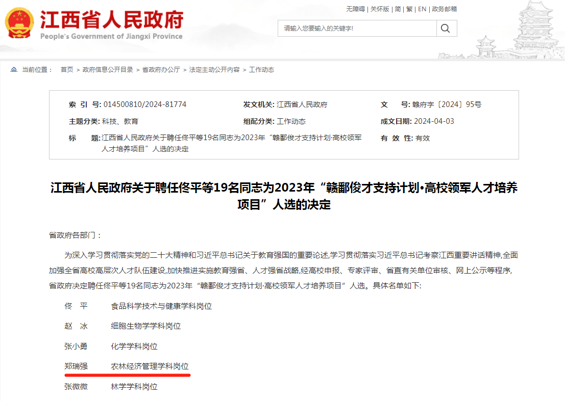 近日,江西省人民政府关于聘任佟平等19名同志为2023年“赣鄱俊才支持计划·高校领军人才培养项目”人选的决定发布,我院郑瑞强教授成功入选,受聘农林经济管理学科岗位。郑瑞强教授成功入选该项目,是我院在人才队伍建设方面取得的重大成绩,也表明我院学科影响力与社会服务能力显著增强。