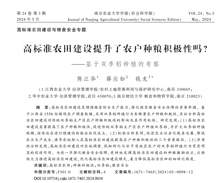 近日,我院陈江华副教授以第一作者身份撰写的论文“高标准农田建设提升了农户种粮积极性吗?——基于双季稻种植的考察”在《南京农业大学学报(社会科学版)》2024年第3期发表,第二作者为华中农业大学白菜担保平台硕士生薛应如(江西农大农林经济管理本科毕业生),通信作者为南京财经大学钱龙副教授。《南京农业大学学报(社会科学版)》是学界公认的高水平期刊,影响因子较高,当前复合影响因子为10.769,综合影响因子6.61,为CSSCI来源期刊、AMI核心期刊、国家社科基金资助期刊。