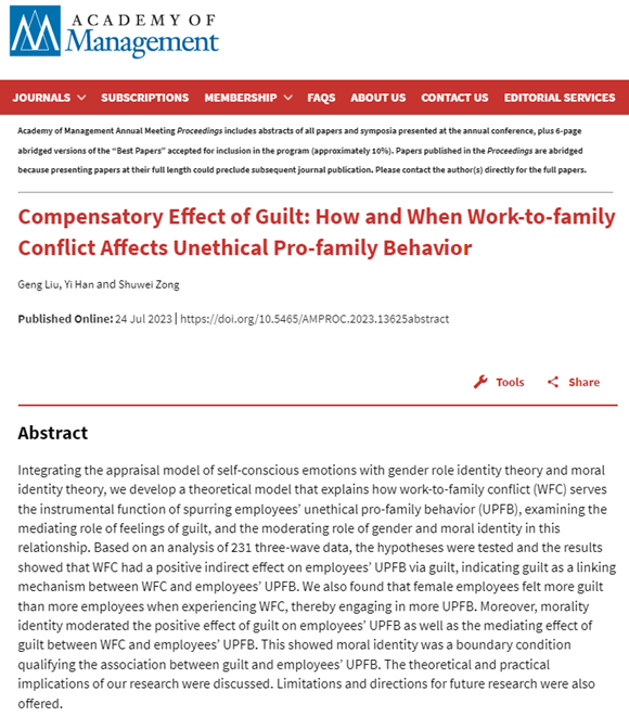 该论文摘要被Academy of Management Annual Meeting Proceedings收录,并于2023年7月24日在线发表。