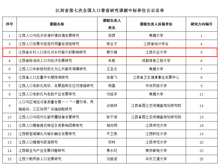 近日,江西省统计局公示江西省第七次全国人口普查研究课题中标单位,经管学院廖文梅教授申报的“江西省乡村人口变化对乡村振兴的影响研究”喜获立项,该研究将基于江西省第七次人口普查数据,聚焦江西乡村人口变化与乡村振兴的关系,从乡村人口变动视角为江西推进乡村振兴战略提供对策建议。此外,该课题研究的开展进一步提升了我院在乡村振兴研究领域的影响力。