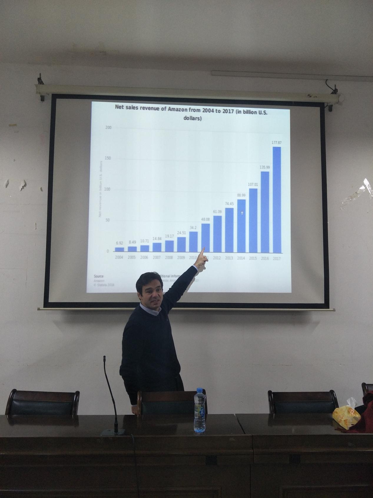 报告中,Luis Vasconcelos教授介绍了在目前经济全球化背景下世界贸易中主要交易平台占比增长情况,如易趣、阿里巴巴和亚马逊等,同时指明了许多新平台在世界贸易中走向成功和失败的一些原因,在如何提高新交易平台成功几率的问题上,深入探讨了交易平台的最优定价策略。会后,Luis Vasconcelos教授与师生们还进行了热烈讨论与互动交流。