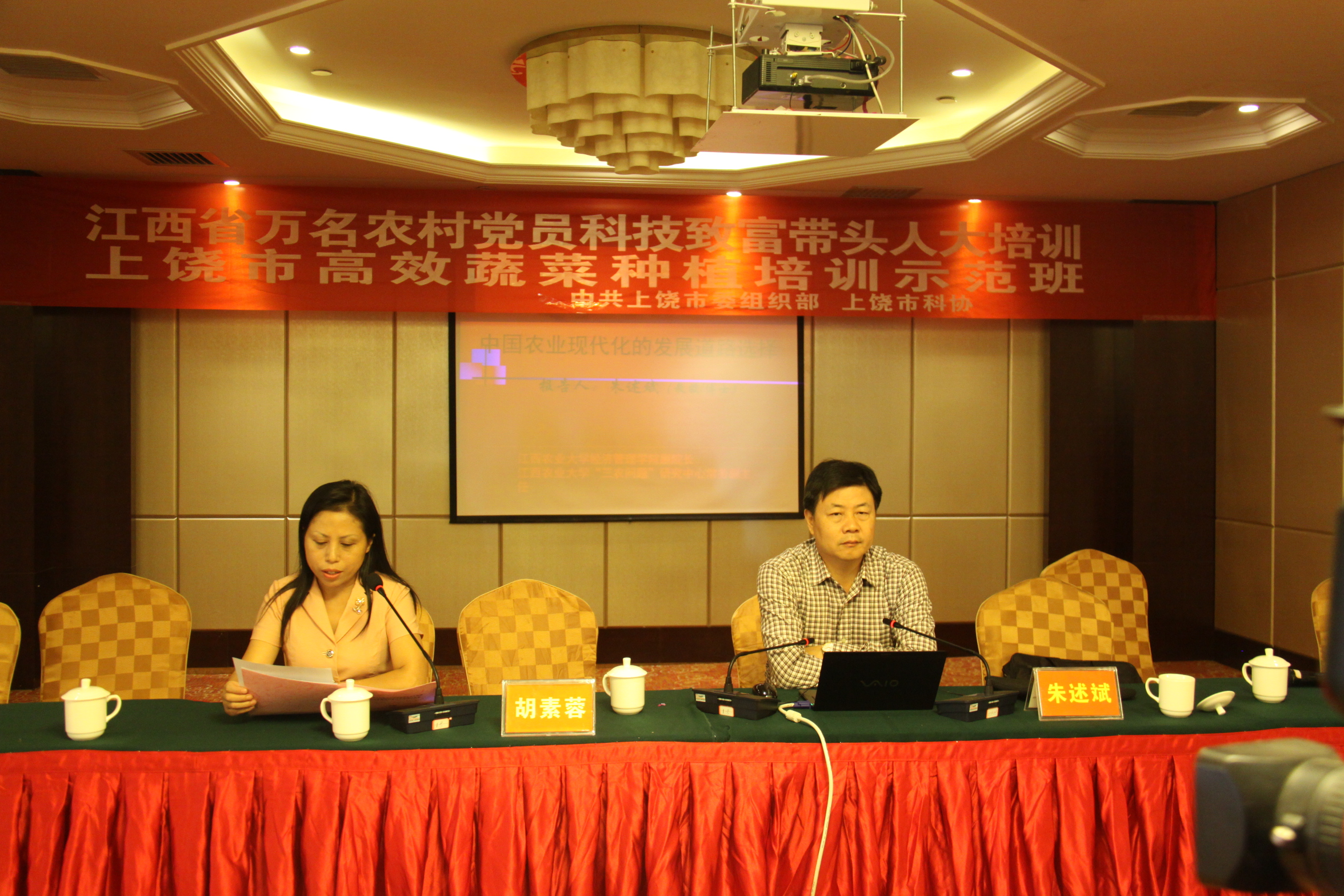 10月16日,江西省万名农村党员科技致富带头人大培训--上饶市高效蔬菜种植技术培训示范班在余干开班,此次培训班由省委组织部、省科协主办,市委组织部、市科协承办,来自全市各区县市的80余名具有一定产业基础、带富能力较强、群众基础较好,并能积极参与当地社会事务的党员致富能人和远教学用典型参加培训。我院副院长朱述斌教授、刘滨博士分别就现代农业组织发展与农民合作社的组织管理进行讲解授课,受到带头人的热烈欢迎与好评。