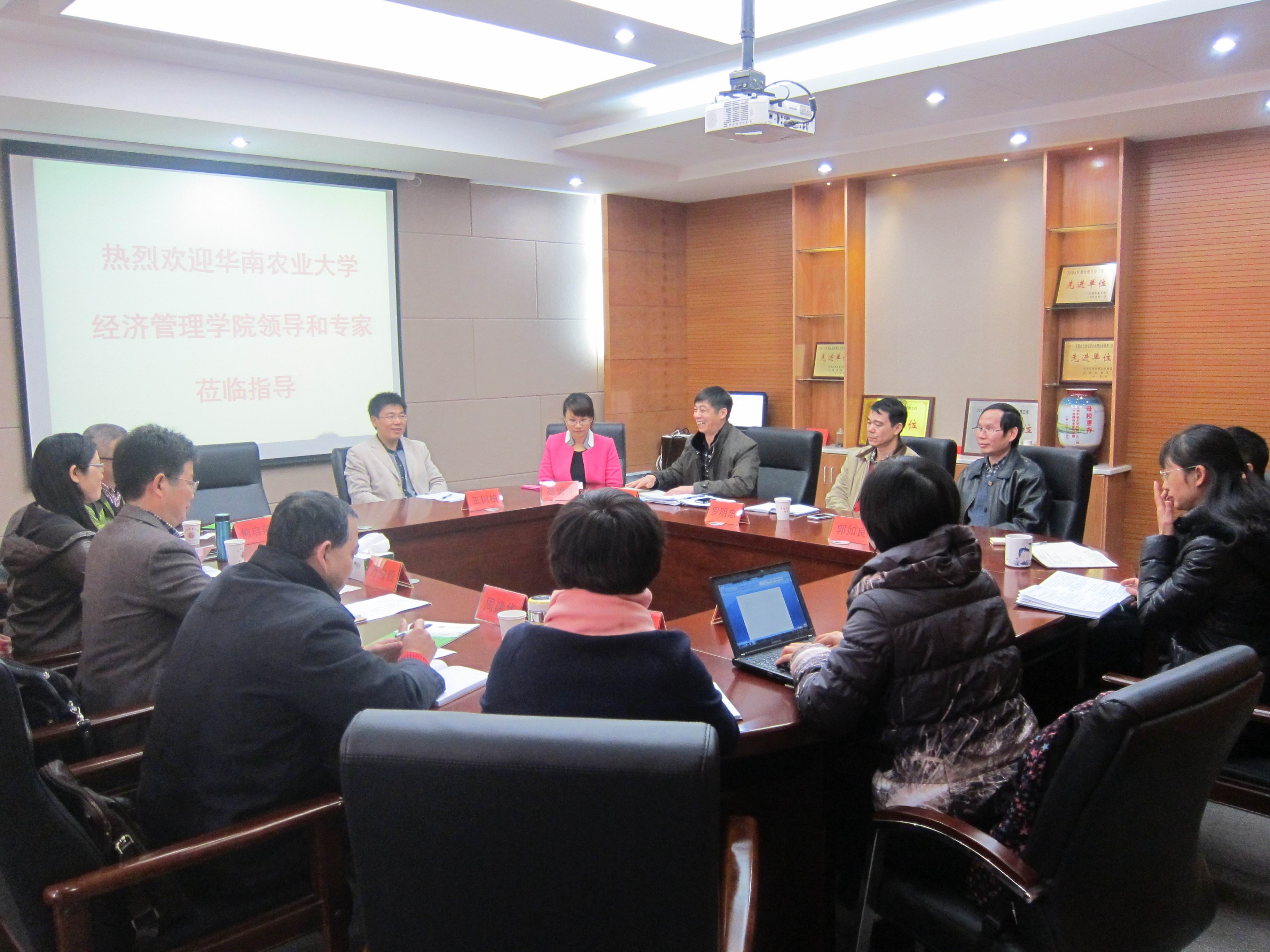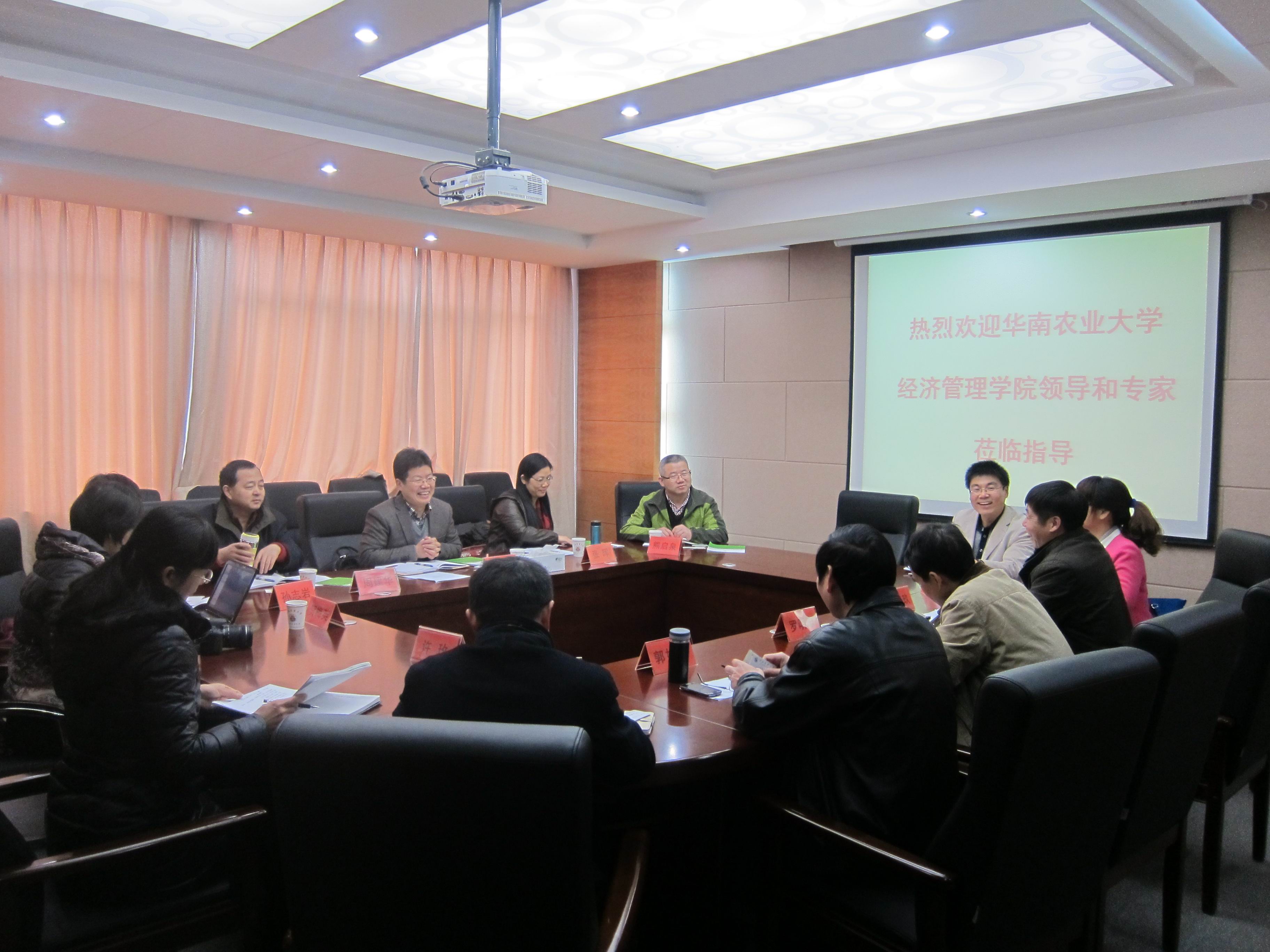 2014年12月2日,华南农业大学白菜担保平台院长万俊毅教授一行6人来我院交流考察。我校校长助理罗明忠、学院党委书记郭如良、院长陈昭玖、党委副书记刘庆言等参加了座谈会。